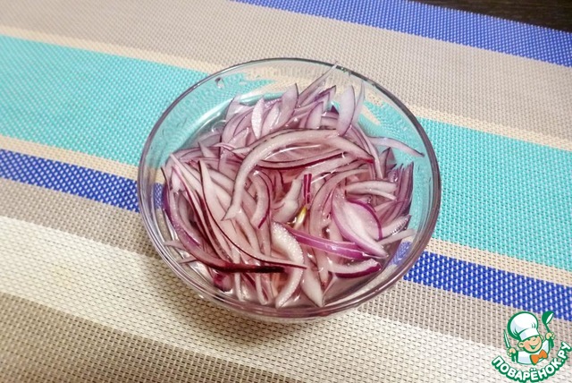 Красный лук нарезать тоненькими полукольцами и залить винным уксусом, слегка разведенным водой. Оставить мариноваться 10 минут.