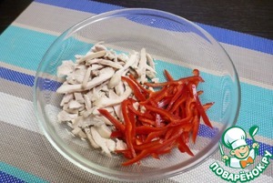 Куриное мясо и сладкий перец нарезать соломкой. Сложить всё в миску.