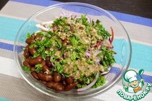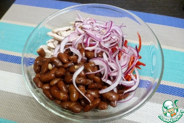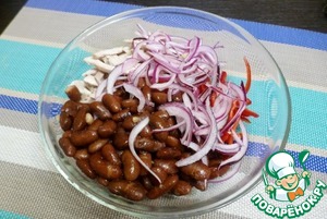 Добавить вареную фасоль и отжатый от уксуса лук.