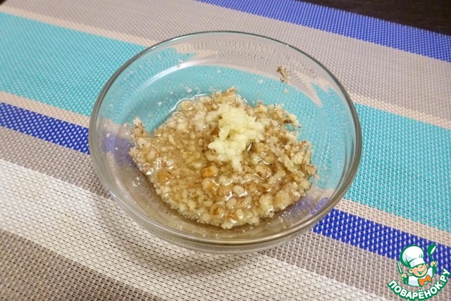 Приготовить заправку для салата. В огригинальном рецепте измельченные орехи просто добавляются в салат. А я сегодня приготовлю заправку с орехами, растерев их почти в пасту. Выдавить в ореховую пасту чеснок, влить оливковое масло и винный уксус по вкусу. Добавить соли. Хорошо перемешать.