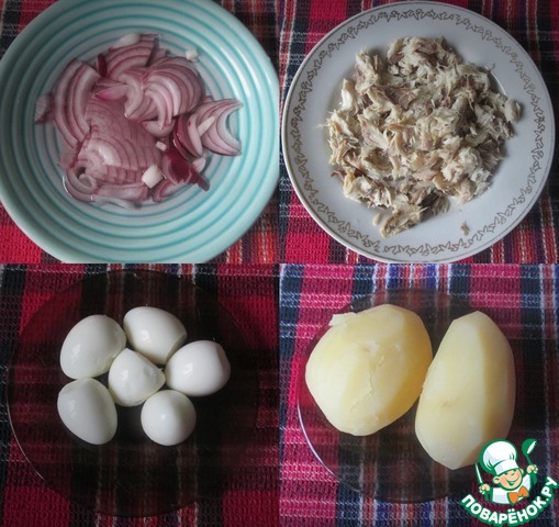 Картофель отвариваем, лук тонко нарезаем. Если лук слишком острый, можно обдать его кипятком или чуть подмариновать в смеси сахара, соли и уксуса. Яйца отвариваем и очищаем. С копченой скумбрии снимаем кожицу и разбираем мякоть на кусочки, удаляя все косточки. -