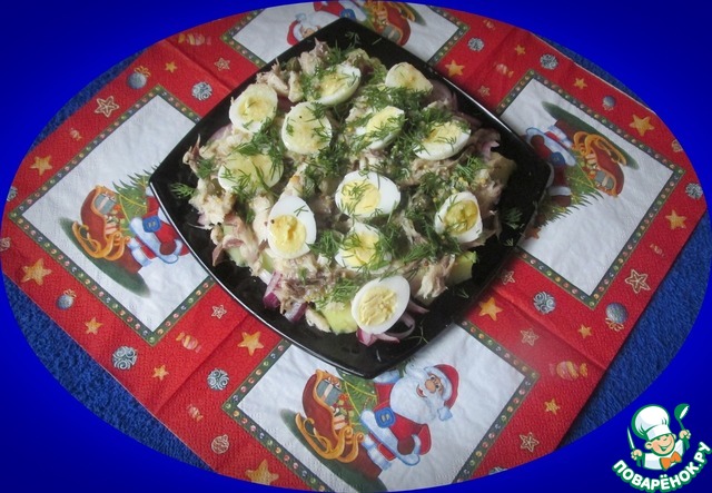 Сверху на рыбе распределяем каперсы. Яйца разрезаем пополам и выкладываем сверху. Соль в салат я добавляла, её достаточно и в рыбе, и в каперсах. -