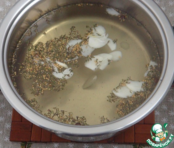Для маринада в кастрюлю налить 0,5 л воды, всыпать соль, сахар, размешать. Добавить перец, тимьян, семена горчицы, чеснок, очищенный и нарезанный тонкими пластинами. Довести маринад до кипения.