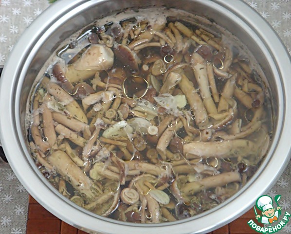 Всыпать опята, снова довести до кипения. Уменьшить огонь и проварить 7 минут.