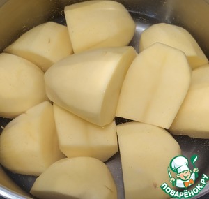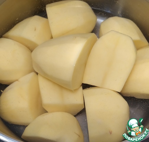 • Приготовить это блюдо несложно, для начала тщательно промываем под холодной проточной водой 600 грамм картофеля. Кладем его в глубокую кастрюлю и заливаем водой и варим картофель до полной готовности, на среднем огне, в течение 30 – 40 минут. Готовность картофеля проверяем вилкой.