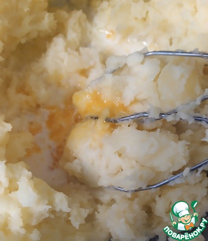 • Далее снимаем кастрюлю с готовым картофелем с плиты, сливаем воду. Перекладываем картофель в миску и взбиваем с помощью миксера. Далее добавляем желток, сливочное масло, молоко и перемешиваем.