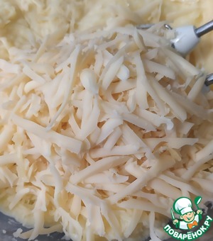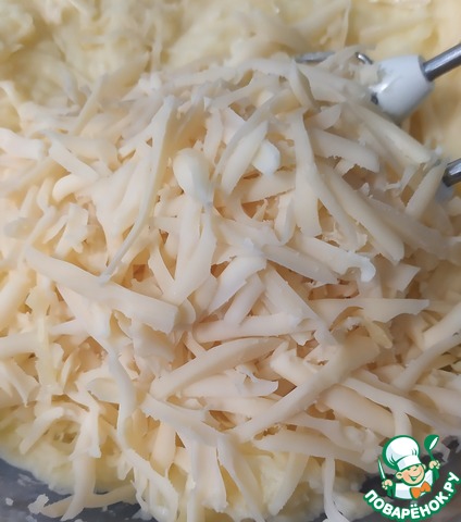 • Затем добавляем тертый сыр и взбиваем до однородной консистенции.