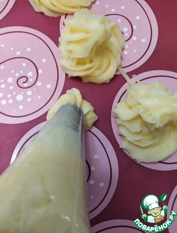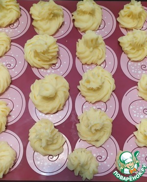 • Остывшую картофельную массу перекладываем в кондитерский мешок с насадкой. Выдавливаем пюре в виде завитков на противень.