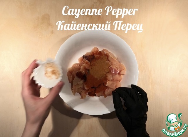 Приступаем к маринаду. К мясу добавляем соевый соус, в данном случае Терияки, паприку и кайенский перец. Хорошенько перемешиваем, накрываем пищевой пленкой и ставим в холодильний на 15-20 минут.