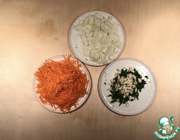 Нарезаем лук, укроп, петрушку, чеснок и натекаем морковь на тёрку.