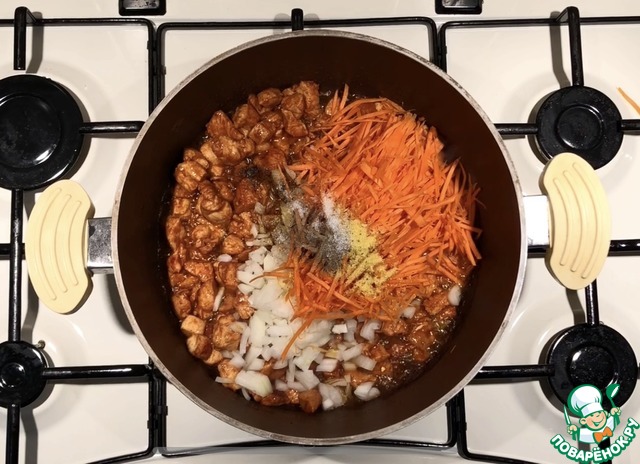 Когда мясо обжарится, добавляем к нему лук, морковь, универсальную приправу, чёрный перец и сахар. Продолжаем обжаривать