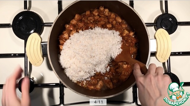 Когда мясо и овощи будут готовы, сливаем воду с риса и добавляем рис в кастрюлю. Хорошо все перемешиваем.