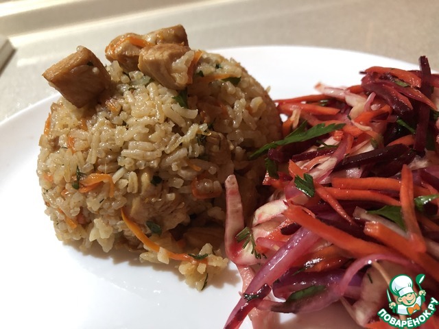 Плов с маринованным куриным филе отличается необычным вкусом и очень нежным и сочным мясом.