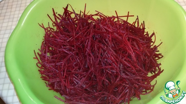 Свеклу помыть, почистить и натереть на тёрке для корейской моркови.