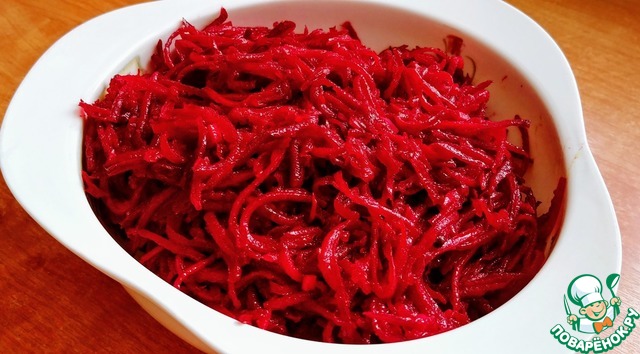 Сложить свеклу в банку, закрыть крышкой и убрать в холодильник минимум на 3 часа. Но если спешить некуда, лучше оставить на 7-8 часов. Я делаю вечером и убираю на ночь. Перед подачей хорошо перемешать.