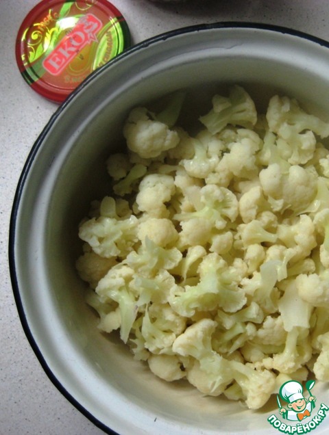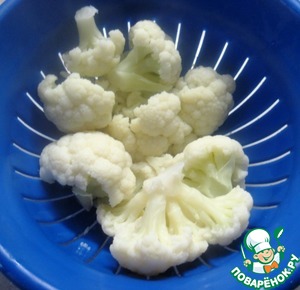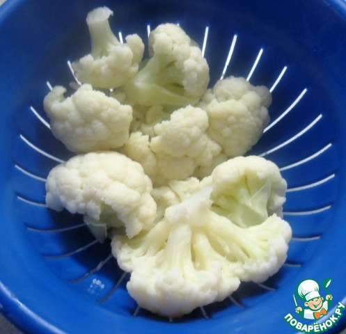 Цветную капусту разделить на крупные соцветия и отварить (я опустила в кипящую, подсоленную воду, дала закипеть и через минуту уже откинула на дуршлаг, нам нравится чтобы капуста оставалась чуть тверденькая). Дать остыть.