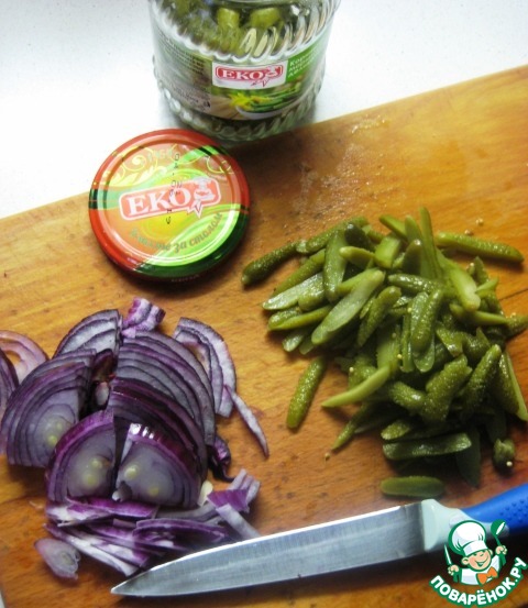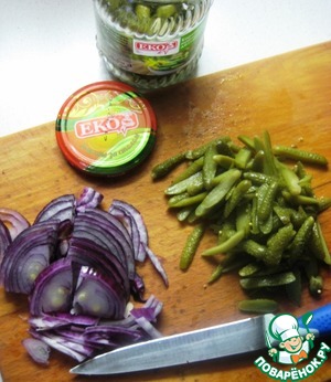 Лук нарезать полукольцами. Совсем маленькие огурчики разрезать вдоль напополам, более крупные - вдоль на четыре части.