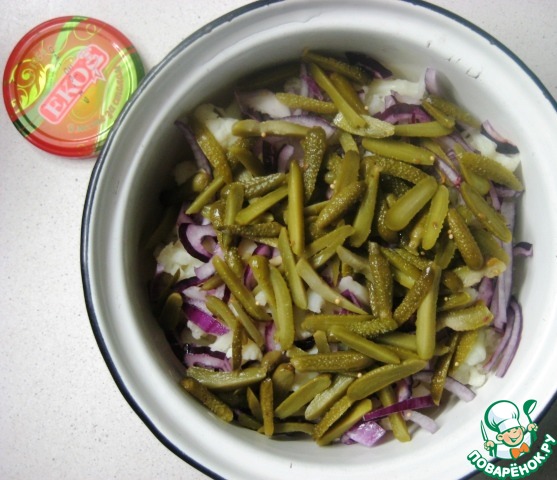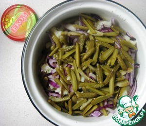 Соединить в удобной для перемешивания посуде капусту, лук и огурчики.