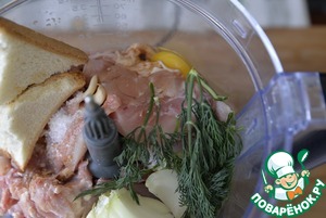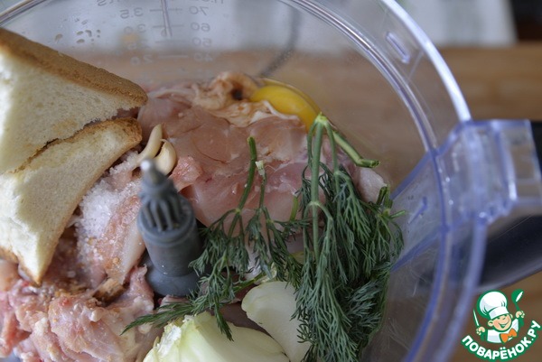 Для приготовления этого рецепта необходимо брать не белое, а красное куриное мясо. Я взяла бёдра (4 шт), срезала с них филе. В чашу кухонного комбайна кладём куриное филе, белый хлеб, яйцо, соль, лук, чеснок, вустерский соус, зелень, у меня укроп.