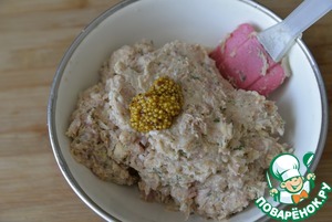 Добавляем в фарш горчицу с зёрнами, её пробивать в комбайне не стоит, так как зёрна размелятся. Перемешиваем.