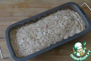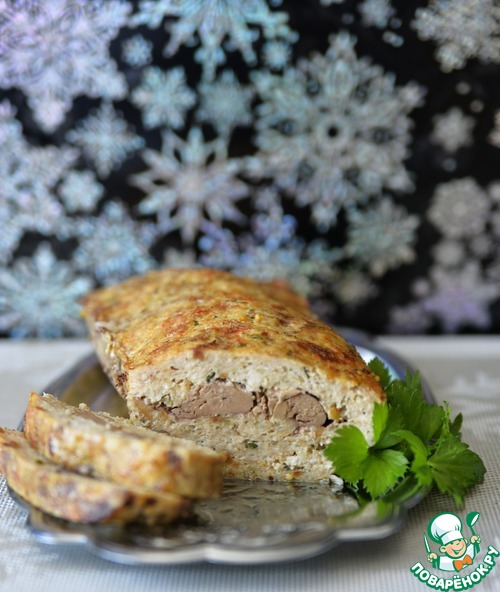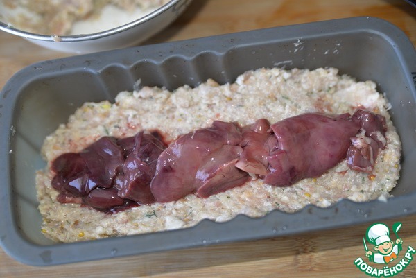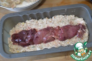 Берём форму "кирпичик", кладём половину фарша на дно. С куриной печени удаляем плёнки и посредине фарша кладём "дорожку" из куриной печени, солим по вкусу.