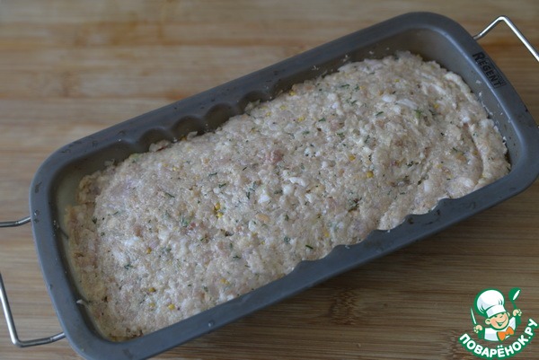 Накрываем второй половиной куриного фарша. Ставим форму в духовку на 200 градусов. Запекаем до готовности 50 минут.