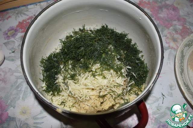 Вот такой вот получился однородный фарш. Добавить в него муку, тертый сыр, зелень. Посолить и поперчить по вкусу. Все хорошо вымесить.