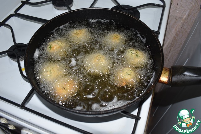 Смешать панировочные сухари с куркумой. Поставить на разогрев масло для фритюра. Я на средней конфорке плиты выставляю огонь чуть ближе к минимальному. Смоченными холодной водой руками аккуратно лепим тефтельки, обваливаем их в панировочных сухарях и отправляем во фритюру.