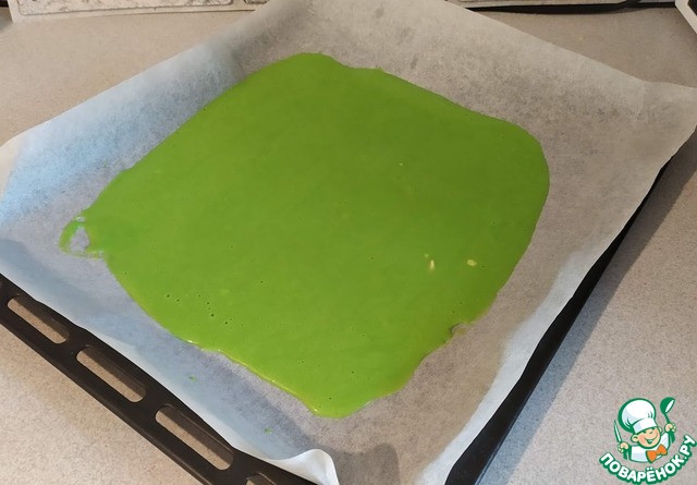 В готовое тесто добавила пару капель зеленого красителя и вылила получившееся тесто на противень, застеленный пергаментом. Важно равномерно распределить тесто, чтобы оно было примерно одинаковой толщины. Выпекать бисквит при 180 градусах, в духовке, около 7-10 мин. Важно, чтобы верх бисквита не стал коричневым.