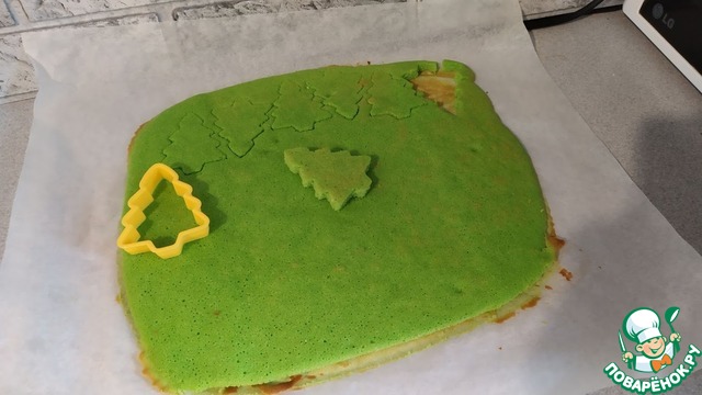 Готовому бисквиту дать остыть и вырезать елочки, с помощью формочки для печенья.