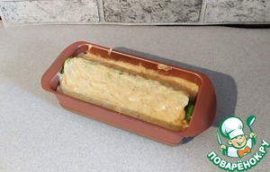 Форму для кекса смазать тонким слоем сливочного масла и выложить на дно немного основного теста. Затем сверху разместить елочки, выкладывая их рядком плотно друг к другу.
