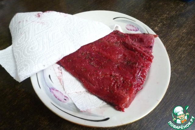 Достать филе горбуши из холодильника. Удалить свеклу и промокнуть поверхность бумажным полотенцем.