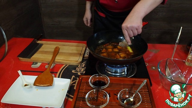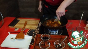 Затем выкладываем в вок обжаренную грудинку, добавляем вино и соевый соус. Снова перемешиваем и заливаем кипятком, чтобы вода полностью покрывала мясо...