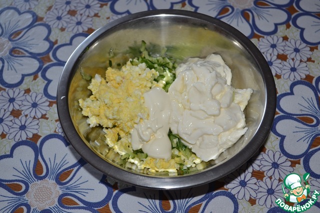 В глубокую посуду выложить маринованный огурец, тёртые яйца, добавить плавленный сыр. Хорошо перемешать. Получилась ароматная и очень вкусная масса, которую уже хочется скушать ложкой.