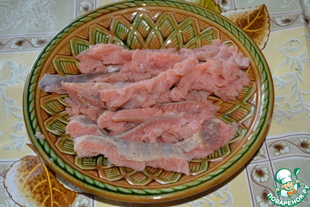 Малосольную красную рыбу нарезать на полоски. Рыбу можно взять любую красную - сёмгу, кету, горбушу и т. д.