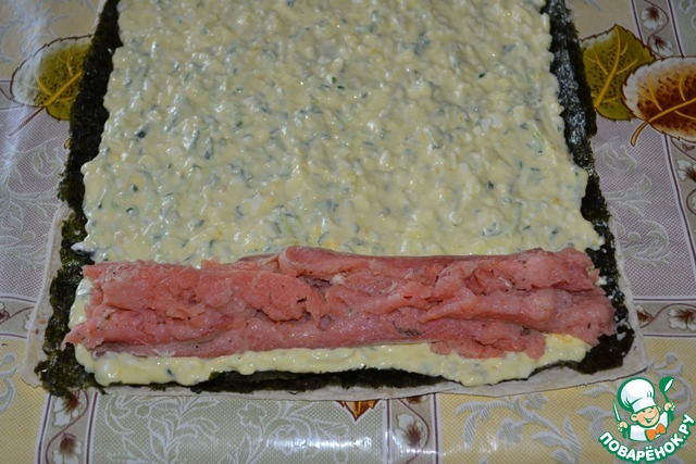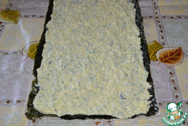 Аккуратно выложить сверху на нори приготовленную яично-сырную массу, не доходя до края 1 см, разровнять.