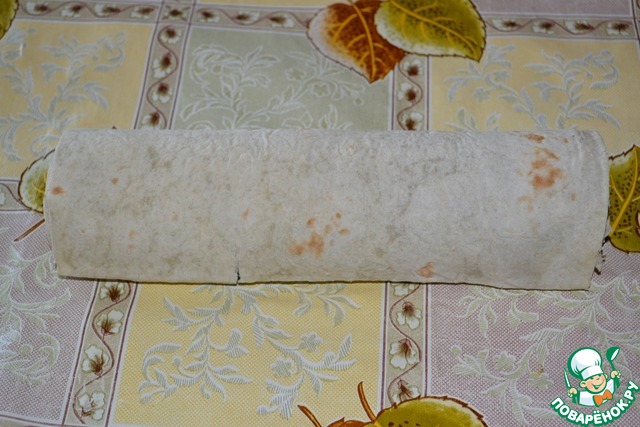 Осторожно скатать в рулет. Завернуть его в пищевую плёнку и убрать в холодильник часа на 2-3 для охлаждения и пропитки.