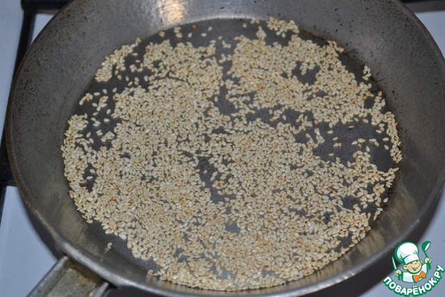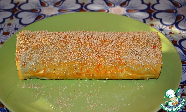 Охлаждённый рулет смазать кетчупом. Очень удобно это делать кулинарной кистью. У меня был кетчуп из жёлтых помидор, собственного консервирования. Сверху посыпать золотистым кунжутом.