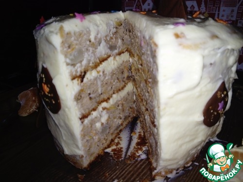 4. Яйца взбиваем с сахаром до пышности, затем добавляем растительное масло и ещё раз взбиваем до соединения компонентов. В яичную массу добавляем муку, корицу и разрыхлитель и хорошо вымешиваем бисквитное тесто. Затем добавляем нарезанные кусочки груши, натёртую морковь, грецкие орехи, перемешиваем.