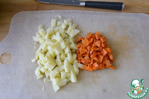 Картофель и морковь чистим и режем мелкими кубиками. -