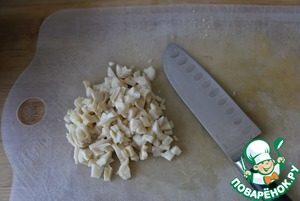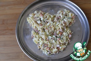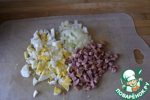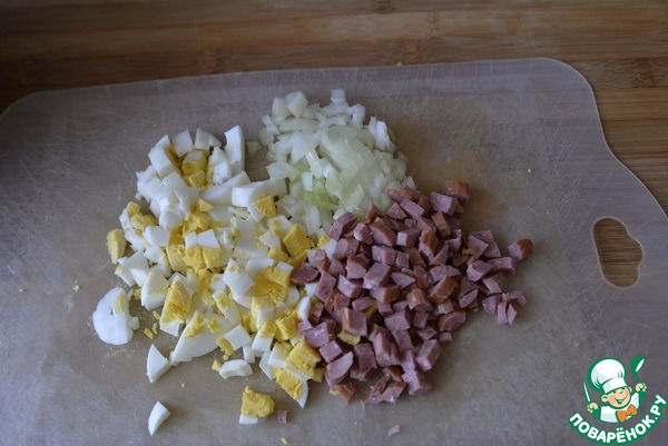 Также мелкими кубиками режем колбасу (у меня куриная, варено-копчёная), яйца и лук.