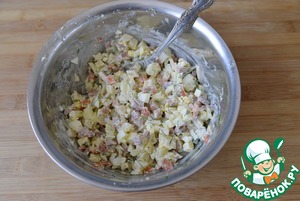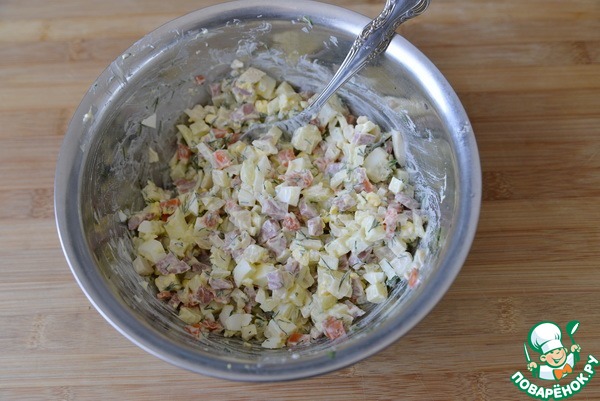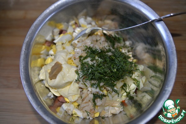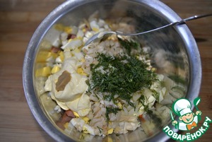 Соединяем все ингредиенты, добавляем мелко нарубленный укроп, майонез и горчицу.