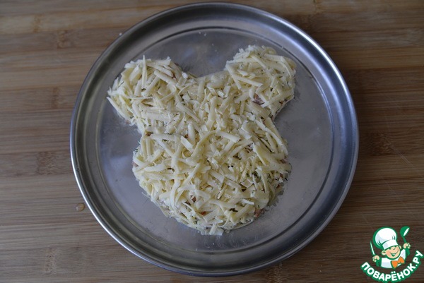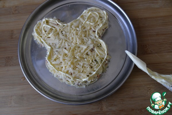 В кулинарный пакет кладём ложку майонеза, отрезаем кончик около 2 мм, рисуем по периметру контур "мышки", обозначая также ушки.
