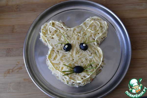 Наступающий год по Восточному календарю - год Белой Металлической Крысы. Хотя он наступит лишь 25 января, но некоторые хозяйки захотят порадовать своих гостей блюдами с символом будущего года уже в ночь с 31 декабря на 1 января. Предлагаю вам свой вариант оформления салата. Таким дизайном можно оформить любой майонезный салат, даже "Оливье" и "Шубу", главное, чтобы не было в нём сырых овощей, и он не потёк.