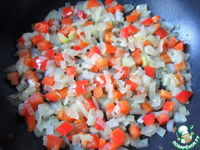 Лук и перец мелко нарезать, обжарить на растительном масле.