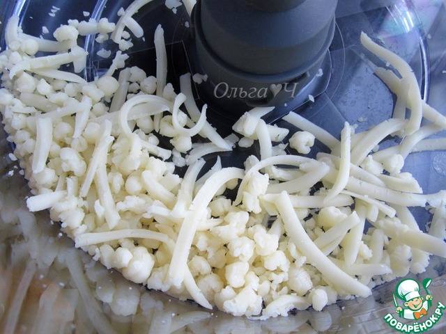 С помощью кухонного комбайна и насадки для шинковки натереть сыр. ***У меня был полутвердый сыр, поэтому некоторые кусочки скатались в комочки, но это никак не повлияло на вкус медальонов.