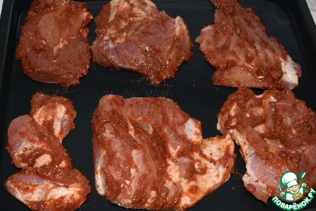 Разогреваем духовку до 190 гр. Достаем необходимое количество мяса и выкладываем его на смазанный растительным маслом противень. Слегка счищаем маринад с верха мяса и со стенок посуды в чашку. На 6 кусочков понадобится около 2 столовых ложек.