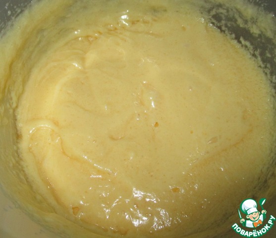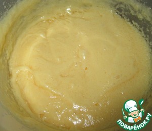 В масляно-сахарную массу вбить три яйца комнатной температуры и размешать миксером до гладкой однородной массы. Именно размешать, взбивать не надо.
