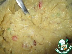 Затем муку соединить с разрыхлителем и просеять в яично-масляную массу, в которую уже добавлены орехи и цукаты. Хорошо размешать. -