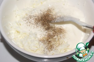 Ввести в йогуртовую смесь, совсем чуть чуть посолить и поперчить. Перемешать и поставить на 5-7 минут в холодильник. -